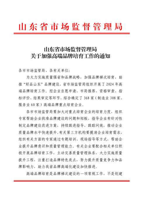 - 近日,山東省市場監(jiān)管局公布了2024年度山東省高端品牌培育企業(yè)名單,我公司憑借出色的品牌實(shí)力與市場競爭力,成功脫穎而出,榮耀入選。